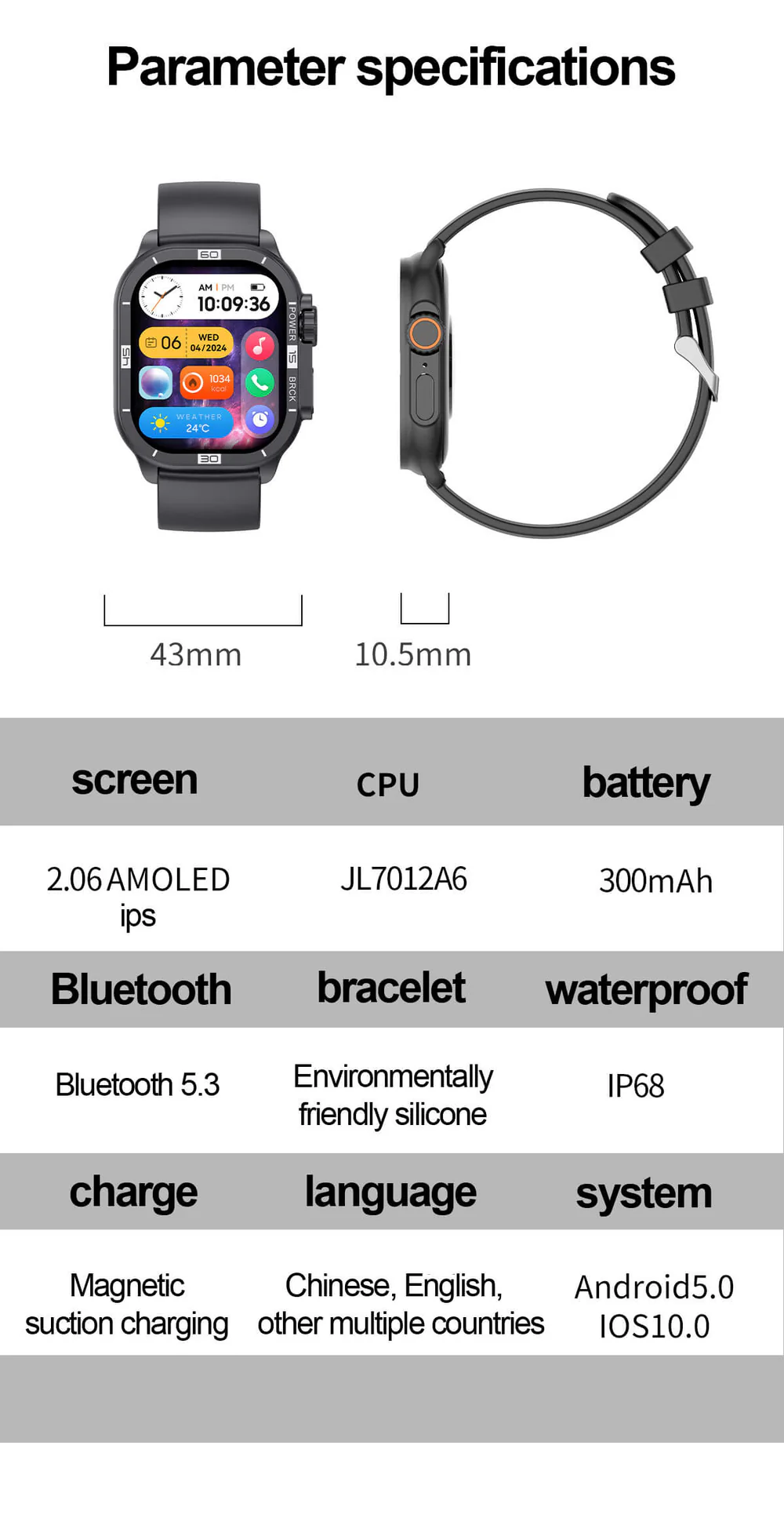 | Smart Assisante: | Alarm Clock Always On Screen Clock Bluetooth Call Calculator Calendar Call & Message Notification Find Your Watch Find Phone Flashlight Phone Camera Control Voice Assistant Wallpaper Weather Push |